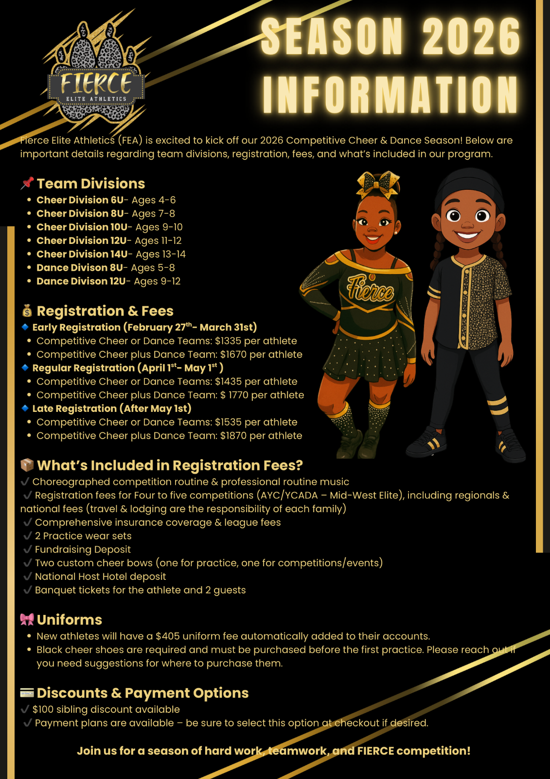 Fierce Elite Athletics is a competitive cheer and dance program designed for athletes ages 4–13 who are ready to grow in skill, confidence, and leadership. Our program focuses on strong fundamentals, advanced technique, teamwork, and performance excellence in a supportive, high-energy environment.